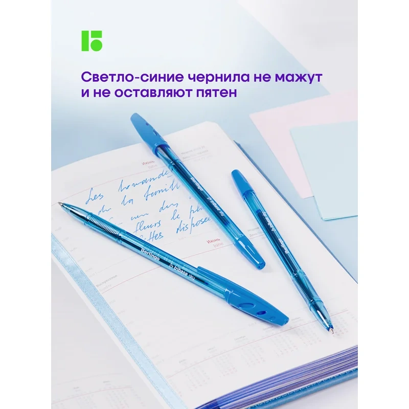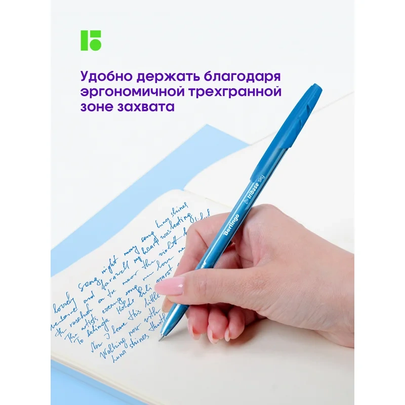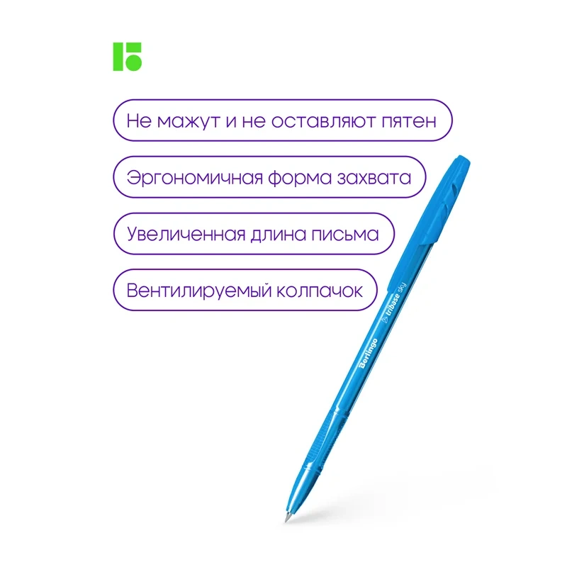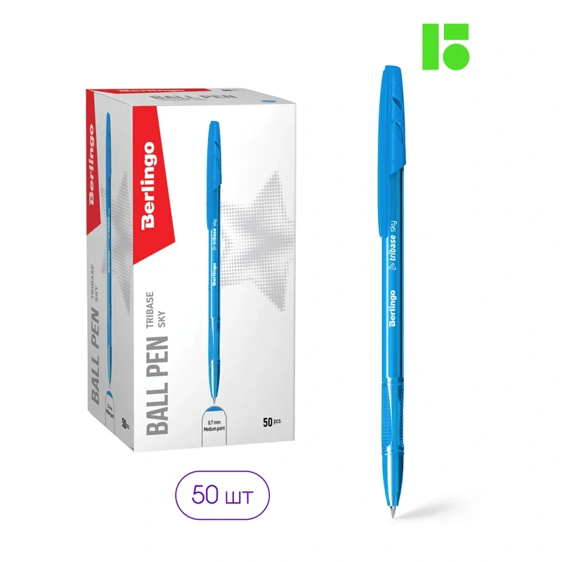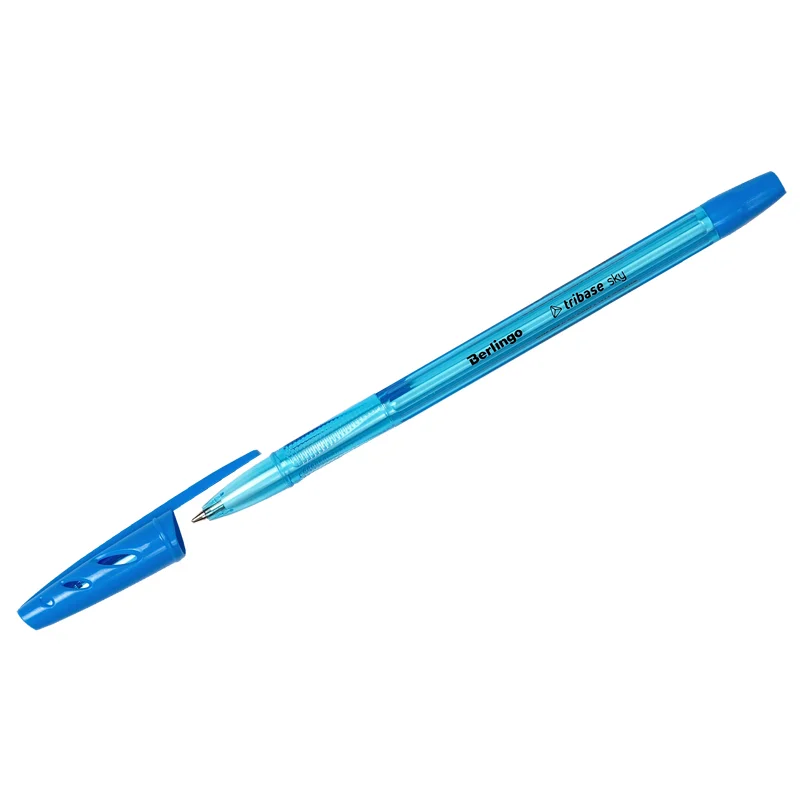 Шариковая ручка Berlingo Tribase Sky со светло-синими чернилами и вентилируемым колпачком, который обеспечивает безопасность при использовании детьми. Эта ручка - стильный аксессуар для работы или учёбы. Пластиковый клип позволит разместить ручку на ежедневниках или блокнотах. Эргономичная трёхгранная зона захвата с рифлением препятствует скольжению пальцев. Качественные чернила обеспечивают чёткое и ровное письмо. Диаметр пишущего узла составляет 0,7 мм, благодаря чему ручка прекрасно подходит для любого стиля письма. Толщина линии письма составляет 0,5 мм, а длина линии письма составляет 1200 метров.