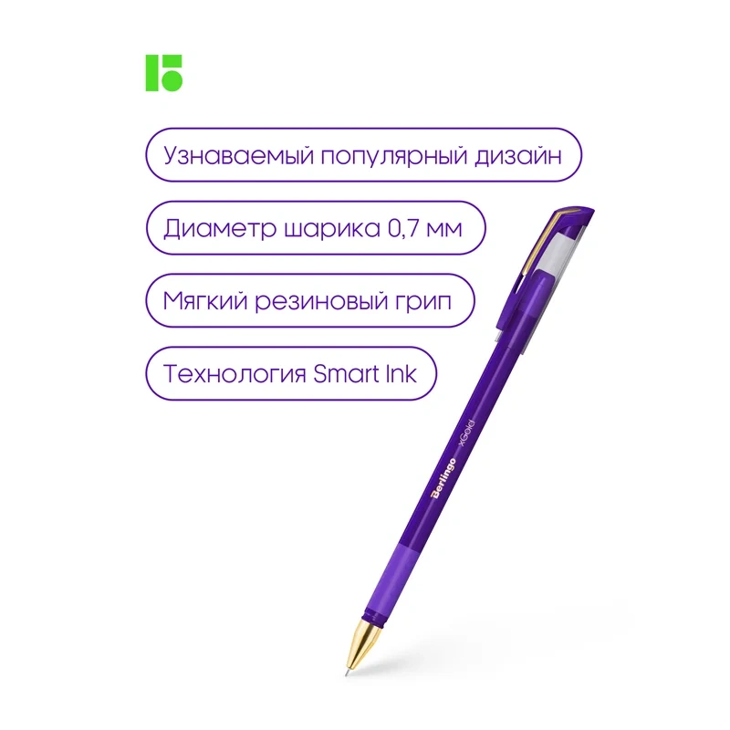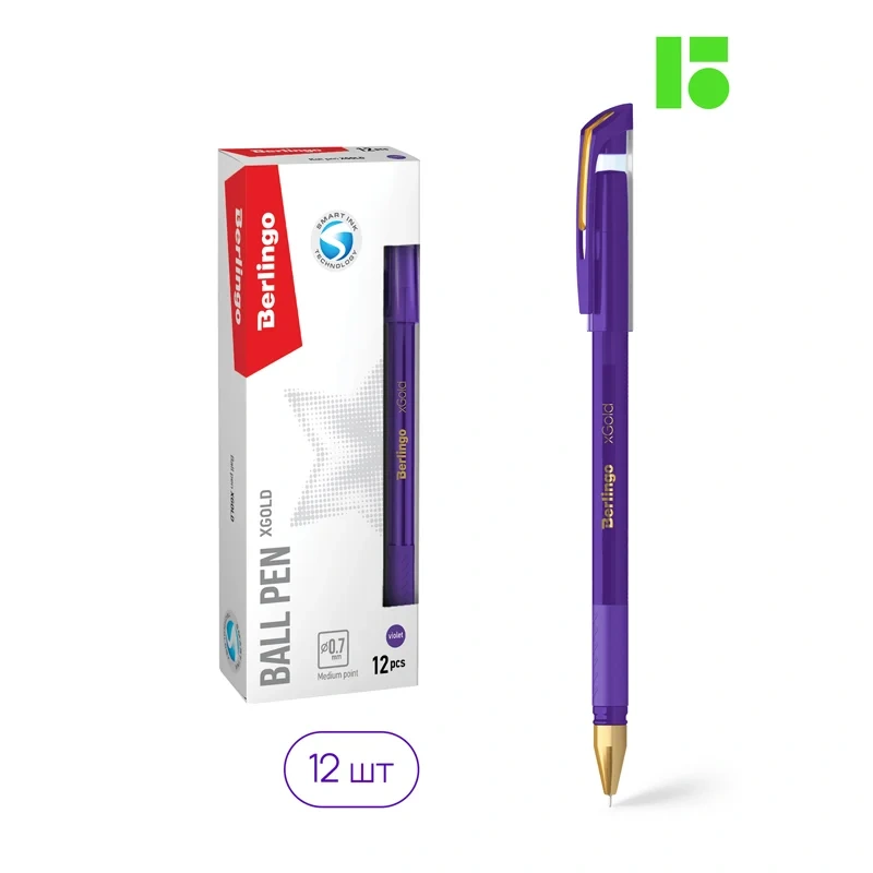 Шариковая ручка шариковая Berlingo xGold – эта флагманская модель ассортимента Berlingo. 12 штук в упаковке. Цвет чернил: фиолетовый. Толщина линии письма: 0,5 мм, длина линии письма: 850 метров. Не раз становилась официальной ручкой «Тотального диктанта» – ежегодной образовательной акции популяризации грамотности. Кроме того, xGold является обладателем премии «Выбор канцелярского рынка 2018». Ручка оснащена вентилируемым колпачком, который обеспечивает безопасность при использовании детьми. Удобный пластиковый клип позволяет закрепить ручку, например, на ежедневнике или тетради. Мягкий резиновый грип препятствует скольжению пальцев и обеспечивает комфортное письмо. Диаметр пишущего узла составляет 0,7 мм, благодаря чему ручка прекрасно подходит для любого стиля письма.
