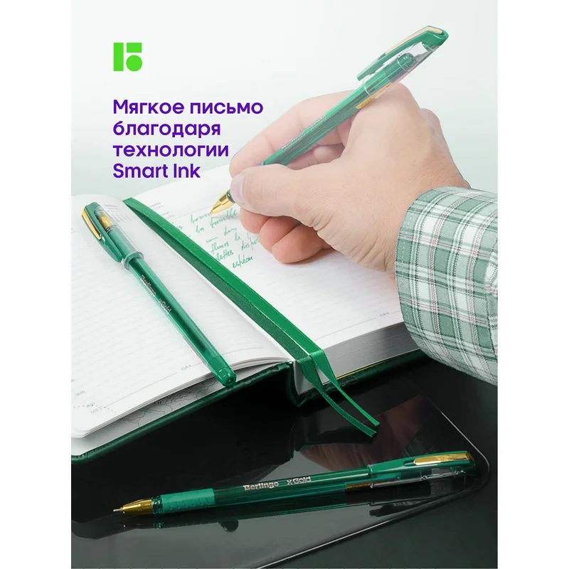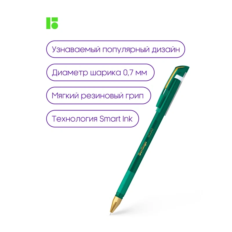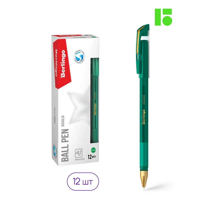 Шариковая ручка шариковая Berlingo xGold – эта флагманская модель ассортимента Berlingo. С 2018 года она стала официальной ручкой «Тотального диктанта» - ежегодной образовательной акции популяризации грамотности. Кроме того, xGold является обладателем премии «Выбор канцелярского рынка 2018».Ручка оснащена вентилируемым колпачком, который обеспечивает безопасность при использовании детьми. Удобный пластиковый клип позволяет закрепить ручку, например, на ежедневнике или тетради. Мягкий резиновый грип препятствует скольжению пальцев и обеспечивает комфортное письмо. Диаметр пишущего узла составляет 0,7 мм, благодаря чему ручка прекрасно подходит для любого стиля письма.Уникальная запатентованная технология Smart Ink обеспечивает лёгкое и приятное письмо за счёт использования чернил пониженной вязкости, специальной конструкции пишущего узла и инновационных материалов шарика и пишущего узла. Такими чернилами можно писать без дополнительных усилий даже при лёгком касании бумаги. Инновационные материалы, используемые для изготовления шарика пишущего узла (карбид вольфрама), обеспечивают долговечность и стабильность качества письма. - Цвет чернил: зелёный;- Толщина линии письма: 0,5 мм;- Длина письма: 850 м;- Цвет корпуса: зелёный;- Количество штук в упаковке: 12;- Тип упаковки: картонная коробка