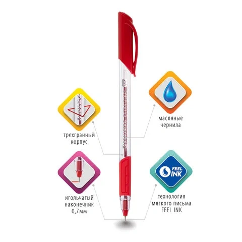 Трехгранная одноразовая шариковая масляная ручка в прозрачном корпусе с резиновым держателем в области захвата. Чернила ультрапониженной вязкости и надежный пишущий узел обеспечивают мягкое и комфортное письмо. Диаметр пишущего узла 0,7 мм создает тонкую линию письма 0,35 мм. Цвет чернил - красный. Лаконичный дизайн соответствует офисному стилю.