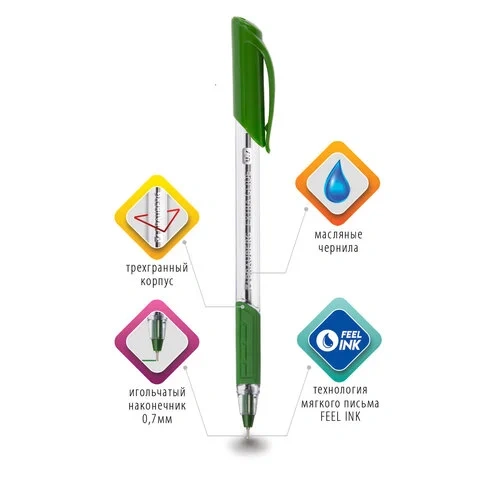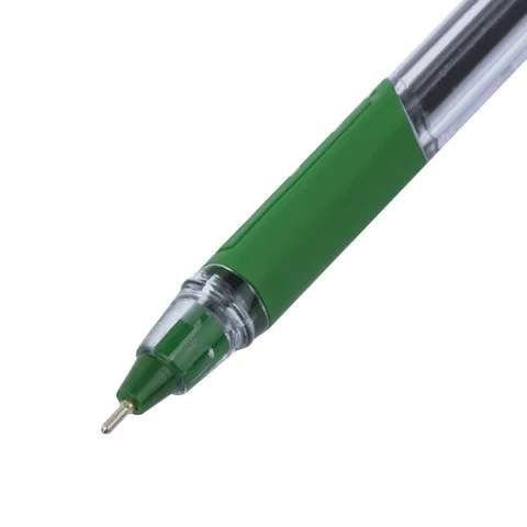 Трехгранная одноразовая шариковая масляная ручка в прозрачном корпусе с резиновым держателем в области захвата. Чернила ультрапониженной вязкости и надежный пишущий узел обеспечивают мягкое и комфортное письмо. Диаметр пишущего узла 0,7 мм создает тонкую линию письма 0,35 мм. Цвет чернил - зеленый. Лаконичный дизайн соответствует офисному стилю.