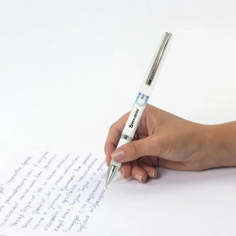 Шариковая масляная ручка имеет круглый белый корпус с печатью и резиновый грип для удобства письма, исключающим скольжение пальцев. Чернила на масляной основе и надежный пишущий узел 0,7 мм обеспечивает мягкое и комфортное письмо, тонкую линию письма, равную 0,35 мм. Цвет чернил - синий.