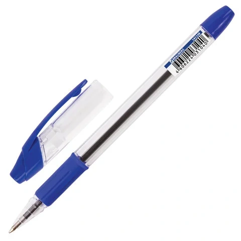 Шариковая ручка с прозрачным корпусом и удобным резиновым держателем, препятствующим скольжению пальцев при письме. Ручка обладает увеличенной длиной письма, что обеспечивает более длительный срок службы по сравнению с другими ручками. Еще одним преимуществом данной модели является наличие сменного стержня, что делает её экономически привлекательной. Длина стержня составляет 140 мм. Диаметр пишущего узла, равный 0,7 мм, создает тонкую линию письма, равную 0,35 мм.Цвет чернил - синий. Стильный корпус соответствует офисному стилю.