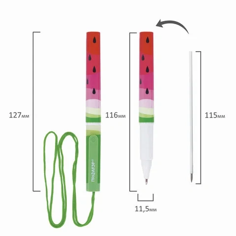 Имеет круглый корпус и стандартный наконечник. Длина сменного стержня составляет 115 мм. Диаметр пишущего узла, равный 0,7 мм, создает линию письма, равную 0,35 мм. Длина шнурка - 42 см. Поставляется в нескольких вариантах цвета (без возможности выбора). Упакована в прозрачный пластиковый стакан.