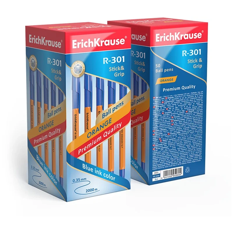 Классическая шариковая ручка Stick&Grip со стандартным типом пишущего узла и заменяемым стержнем. Ручка имеет непрозрачный оранжевый шестигранный корпус с удобной профилированной грип-зоной из резины и вентилируемый колпачок. Цвет колпачка, грип-зоны и заглушки соответствует цвету чернил. 5-канальный пишущий узел с диаметром шарика 0.7 мм в сочетании с быстросохнущими чернилами обеспечивает мягкое и быстрое письмо. Длина непрерывной линии составляет 2000 м при толщине 0.35 мм, что является одним из лучших показателей в своей категории. Модель R-301 Orange 0.7 Stick&Grip имеет узнаваемую запатентованную форму и стала одним из бестселлеров в ассортименте шариковых ручек ErichKrause® более чем в пятидесяти странах мира.