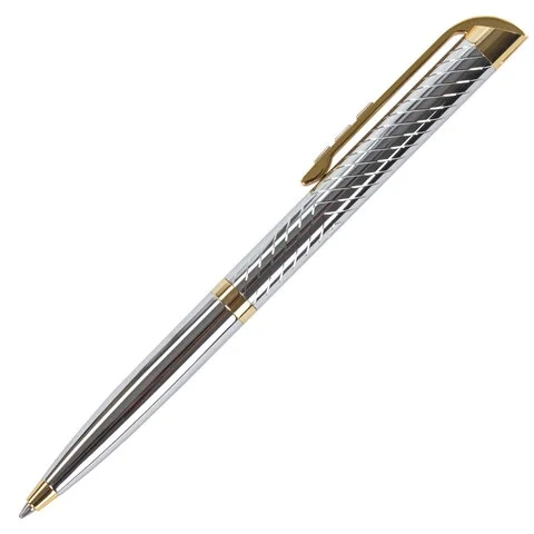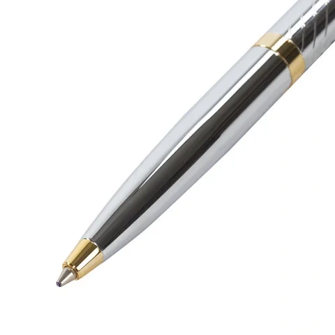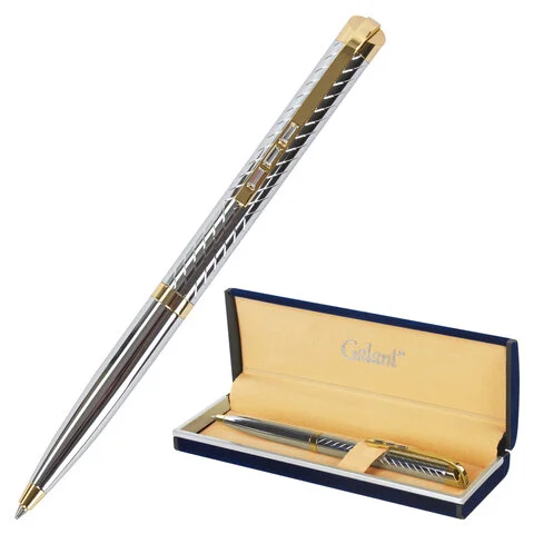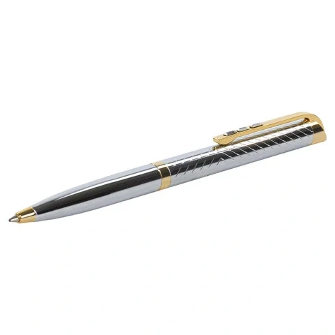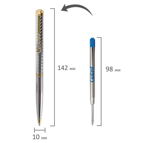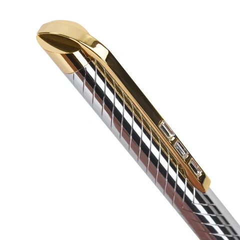 Корпус ручки серебристого цвета выполнен из латуни с хромированным покрытием и декорирован позолоченными деталями. Синий цвет чернил, длина стержня составляет 98 мм, а диаметр пишущего узла - 0,7 мм. Поставляется в индивидуальном подарочном футляре.