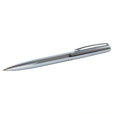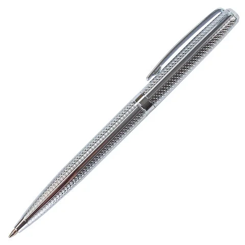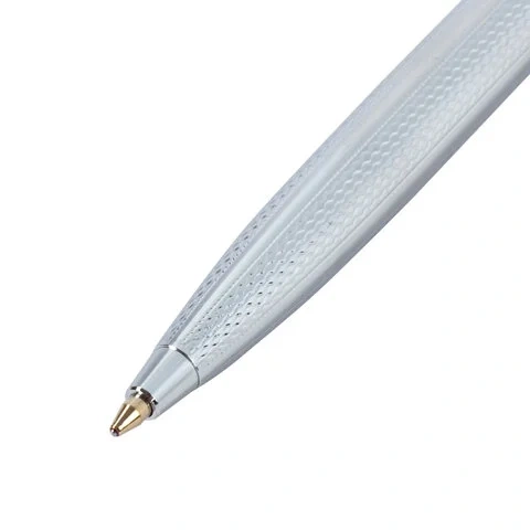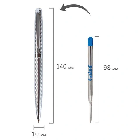Корпус ручки серебристого цвета выполнен из латуни с хромированным покрытием и декорирован гравировкой. Синий цвет чернил, длина стержня составляет 98 мм, а диаметр пишущего узла - 0,7 мм. Поставляется в индивидуальном подарочном футляре.