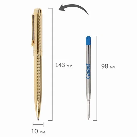 Корпус ручки золотистого цвета выполнен из латуни и декорирован золотистой гравировкой. Синий цвет чернил, длина стержня составляет 98 мм, а диаметр пишущего узла - 0,7 мм. Поставляется в индивидуальном подарочном футляре.