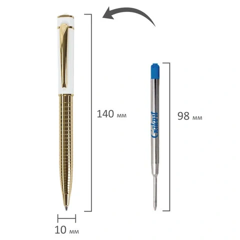 Корпус ручки золотистого цвета выполнен из латуни и декорирован золотистой гравировкой. Синий цвет чернил, длина стержня составляет 98 мм, а диаметр пишущего узла - 0,7 мм. Поставляется в индивидуальном подарочном футляре.