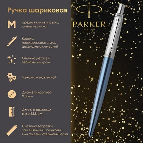 Шариковая ручка в тонком корпусе из полированной нержавеющей стали голубого цвета с деталями цвета хром. ВНИМАНИЕ! С марта 2020г. подарочные коробки ручек ТМ Parker прекратили комплектоваться лифлетами (листовками с гарантийным талоном).
