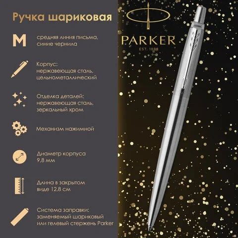 Шариковая ручка класса люкс Parker Jotter имеет узнаваемый классический дизайн. Корпус из нержавеющей стали. Детали отделки — сталь. Оснащена кнопочным механизмом. Комплектуется индивидуальным футляром и стержнем с пастой синего цвета. Толщина линии письма — 0,8 мм.