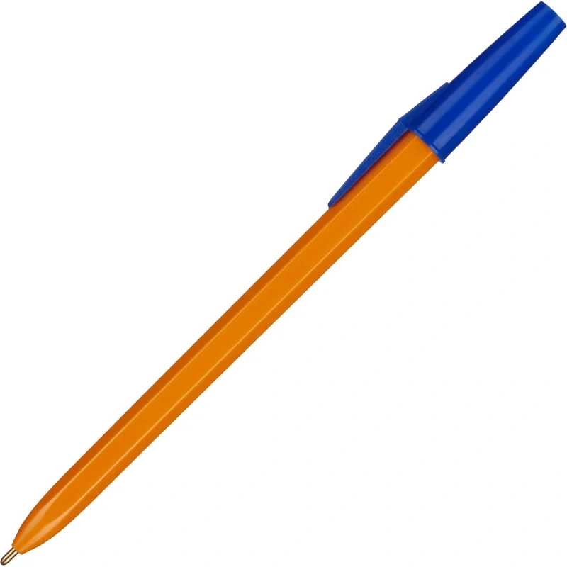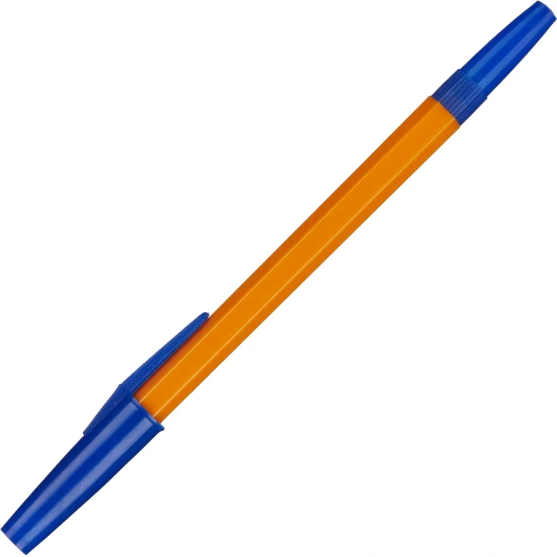 Ручка шариковая 'Школьная', в пластиковом корпусе оранжевого цвета из полистирола. Цвет заглушки и колпачка синий, соответствует цвету чернил. Удобная зона захвата. Цвет чернил синий. Диаметр шарика 1 мм, толщина линии письма 0,7 мм. Максимальная длина письма — 1500 м.