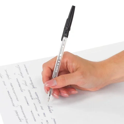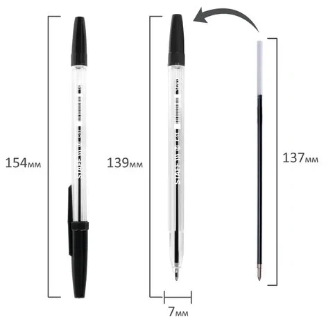 Шариковая ручка в прозрачном корпусе со стандартным наконечником. Сменный стержень длиной 137 мм. Диаметр пишущего узла 1,0 мм создает тонкую линию письма 0,5 мм. Цвет чернил - черный. Мягкое письмо и экономичный расход чернил.