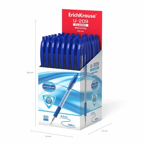 Шариковая ручка автоматическая Erich Krause U-209 Classic синяя, 0.3мм, прозрачный корпус