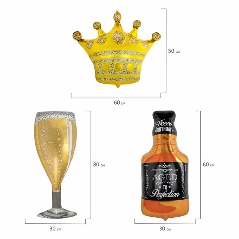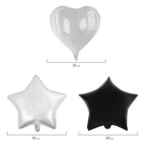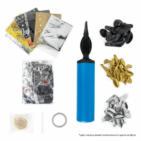 52 шт. высококачественных однотонных шаров классической формы золотистого, серебристого и чёрного цветов и фигурные шары разного размера (от 22 см до 80 см). Шары в наборе изготовлены из натурального латекса (латексные), обеспечивающего прочность при аккуратном использовании, и из прозрачной лавсановой пленки (фольгированные), покрытой специальной краской. В результате поверхность становится похожей на фольгу.