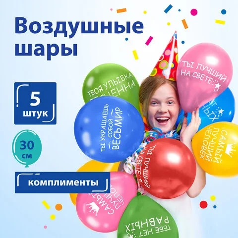 Высококачественные шары классической формы с рисунком 'Комплименты'. Изготовлены из натурального латекса, обеспечивающего прочность изделия при аккуратном использовании. Стандартный размер - 30 см. 5 шаров 5 различных насыщенных цветов украсят любой интерьер.