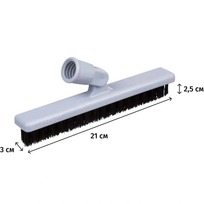 Крепление универсальное: подходит как для бытовых рукояток с 'итальянской' и 'немецкой' резьбой, так и для классических алюминиевых рукояток диаметром 22-24 мм. Компактные размеры 210х30 мм и высота щетины 25 мм делают модель удобной для транспортировки и хранения, например, в сумке мобильной уборочной бригады.