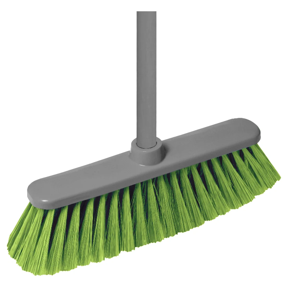 Классическая щётка для уборки помещений. Щетина расположена под углом, что позволяет захватывать максимальную площадь подметаемой поверхности, и имеет оптимальную жесткость для комфортного сбора пыли и мусора. В комплекте прочная металлическая рукоятка 110 см, покрытая пластиком. Удобная, легкая, комфортная в использовании дома и на даче. Состав: полипропилен, щетина ПЕТ, сталь.