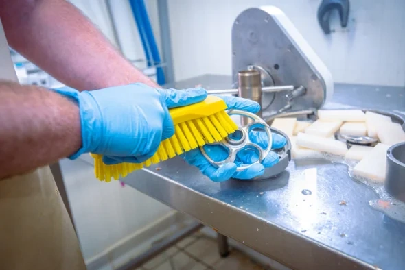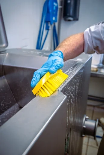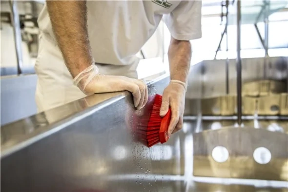 Универсальная щетка с ворсом, расположенным под углом, предназначена для чистки столов, конвейерных лент, разделочных досок, ведер, больших мерных ковшей и оборудования, где необходима очистка в углах. С одной стороны щетки ворс более жесткий,что позволяет удалять самые сильные загрязнения.