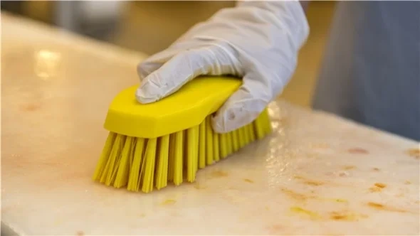 Универсальная щетка с ворсом, расположенным под углом, предназначена для чистки столов, конвейерных лент, разделочных досок, ведер, больших мерных ковшей и оборудования, где необходима очистка в углах. С одной стороны щетки ворс более жесткий,что позволяет удалять самые сильные загрязнения.