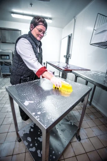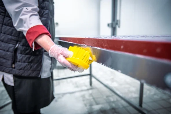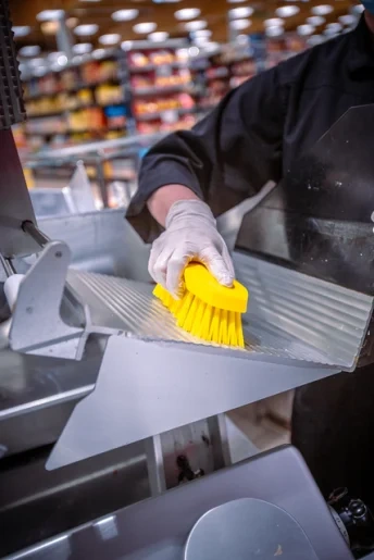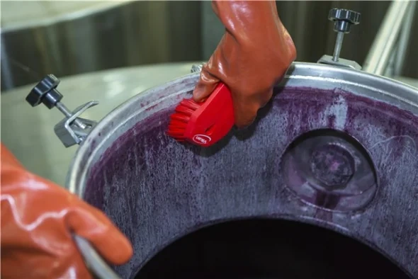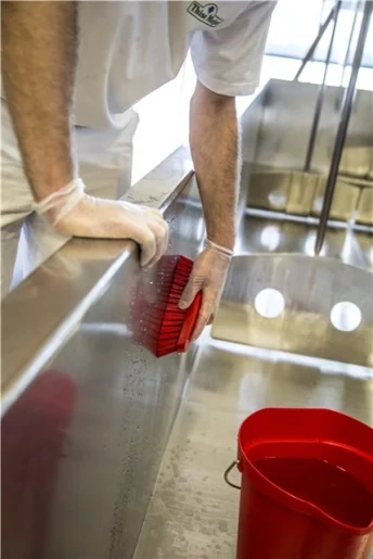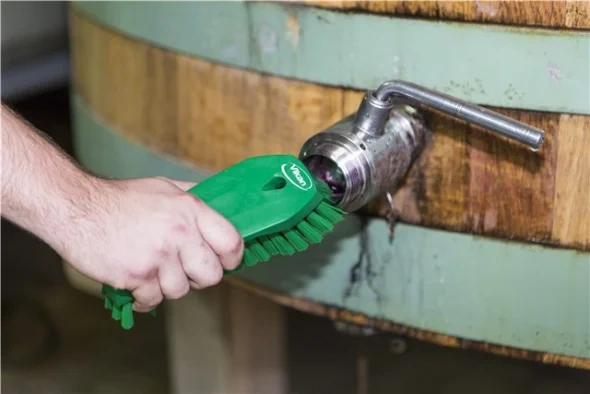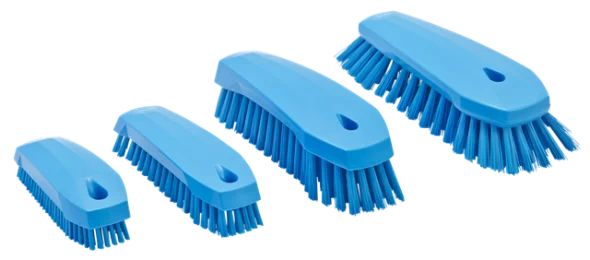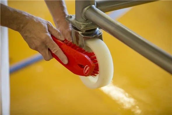 Универсальная щетка с ворсом, расположенным под углом, предназначена для чистки столов, конвейерных лент, разделочных досок, ведер, больших мерных ковшей и оборудования, где необходима очистка в углах. С одной стороны щетки ворс более жесткий,что позволяет удалять самые сильные загрязнения.