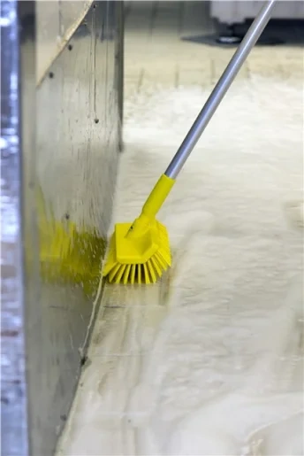 Изогнутая колодка этой щетки предназначена для уборки вдоль стыка между полом и стеной, а также пола под оборудованием, т.к. угол наклона соединительной части позволяет пользоваться щеткой горизонтально.