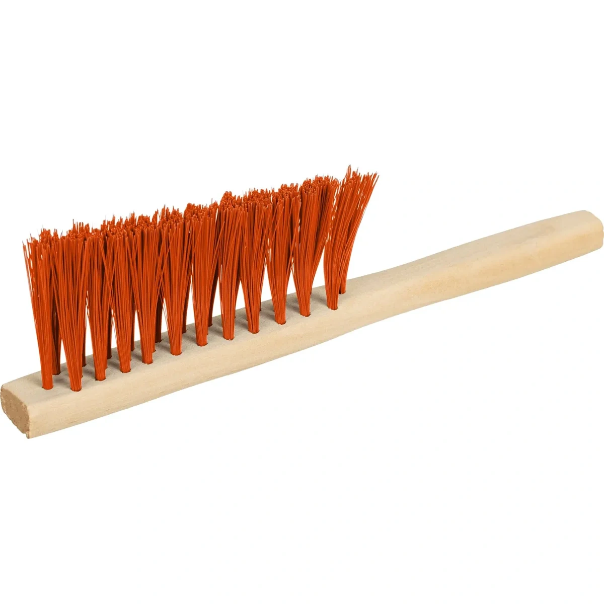 Колодка выполнена из дерева, щетина - из прочного синтетического материала средней жесткости. Волокна длиной 6.5 см закреплены вручную в три ряда, что обеспечивает плотное и надежное сметание. Ручка деревянная, цельнолитая, длиной 17 см.