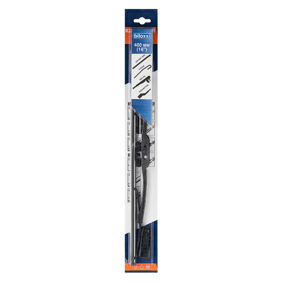 Щетка стеклоочистителя Biloxxi каркасная 16, 400мм прочная и износостойкая. В основе конструкции щетки лежит высокотехнологичная технология где чистящее лезвие лобового стекла посредством коромысел прикреплена к металлическому каркасу. Чистящее лезвие оставаясь при этом довольно подвижным, что и обеспечивает ему плотное прилегание к изогнутому лобовому стеклу. Рабочая поверхность лезвия выполнена из натурал??ного каучука, который сохраняет отличные эксплуатационные качества как на морозе, так и в жару, не скрипит и не оставляет на стекле царапин. Щётки стеклоочистителей Biloxxi рассчитаны минимум на 350 000 рабочих циклов. Щётки укомплектованы адаптерами: подходят для 4-х типов креплений (U-hook, Bayonet, Push Button 16 mm, Side Pin 22mm). Универсальная конструкция позволяет применять щётки как для праворульных, так и для леворульных авто.