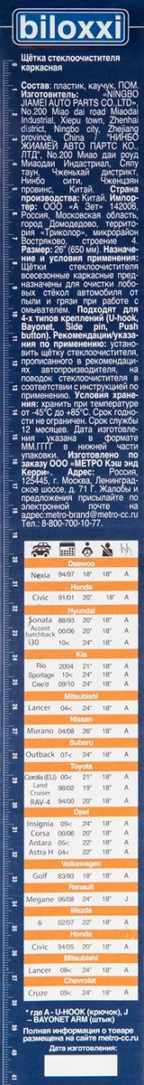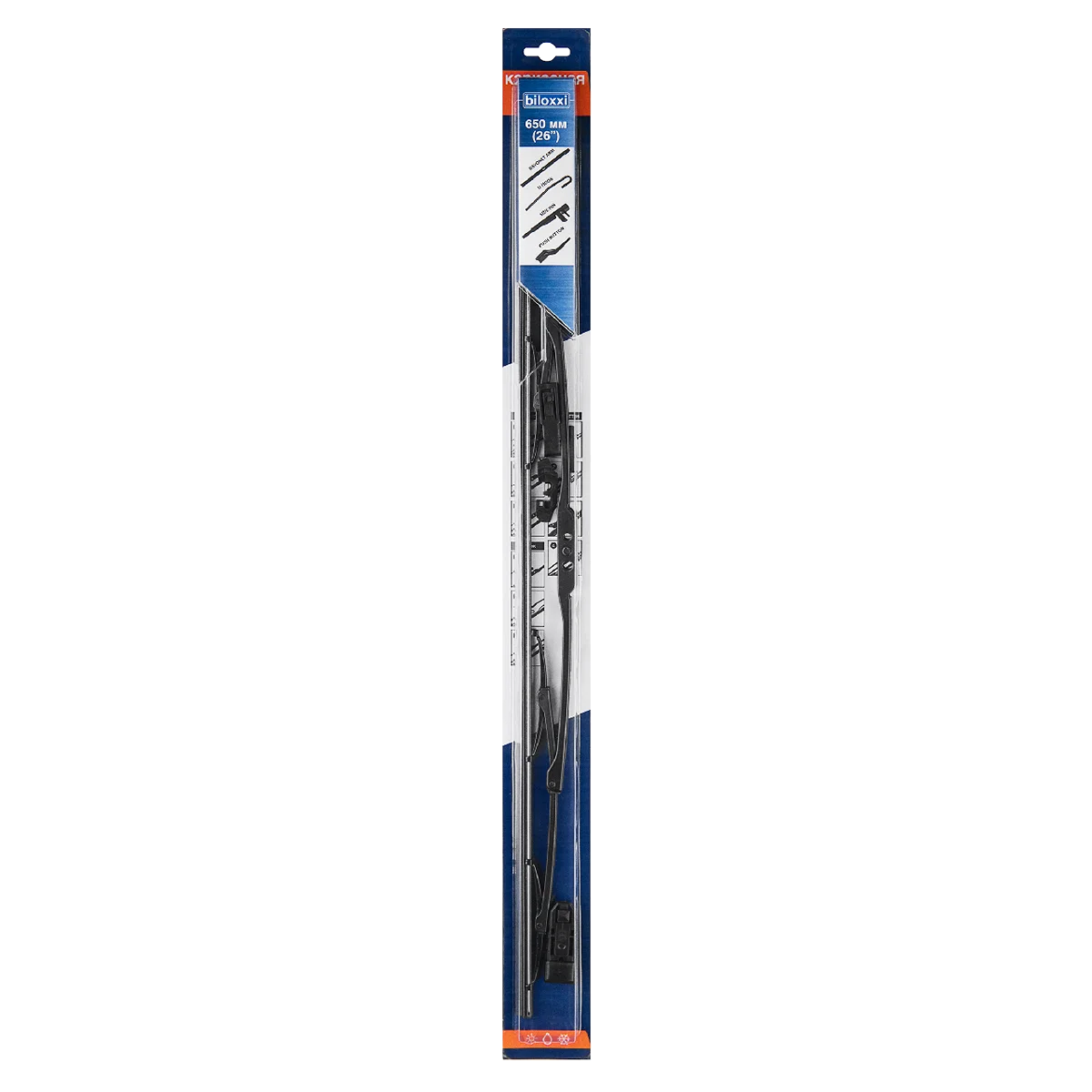 Щетка стеклоочистителя Biloxxi каркасная 25, 650мм прочная и износостойкая. В основе конструкции щетки лежит высокотехнологичная технология где чистящее лезвие лобового стекла посредством коромысел прикреплена к металлическому каркасу. Чистящее лезвие оставаясь при этом довольно подвижным, что и обеспечивает ему плотное прилегание к изогнутому лобовому стеклу. Рабочая поверхность лезвия выполнена из натурал??ного каучука, который сохраняет отличные эксплуатационные качества как на морозе, так и в жару, не скрипит и не оставляет на стекле царапин. Щётки стеклоочистителей Biloxxi рассчитаны минимум на 350 000 рабочих циклов. Щётки укомплектованы адаптерами: подходят для 4-х типов креплений (U-hook, Bayonet, Push Button 16 mm, Side Pin 22mm). Универсальная конструкция позволяет применять щётки как для праворульных, так и для леворульных авто.