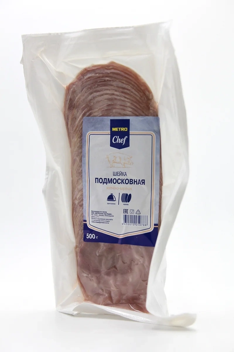 Шейка подмосковная варено-копченая под новой маркой Metro Chef ориентирована на использование профессиональными клиентами. Продукт мясной из свинины, в нарезке. Подходящее предложение для организации банкета и сервировки стола мясными тарелками.