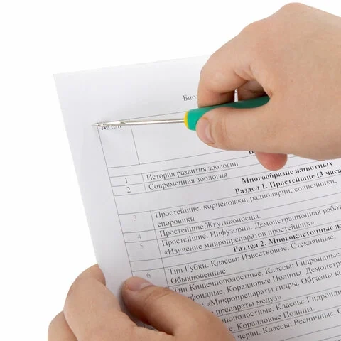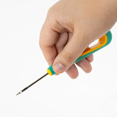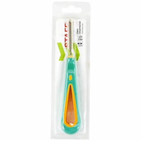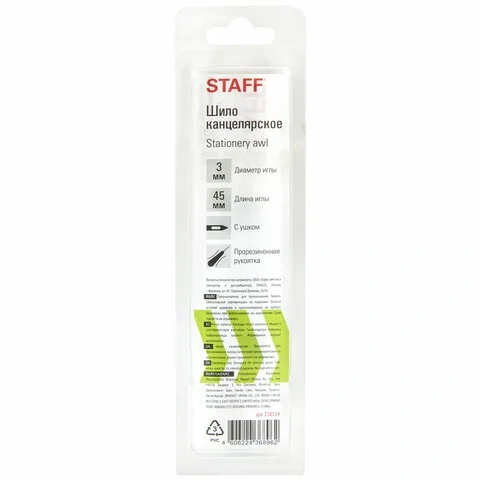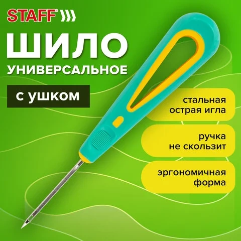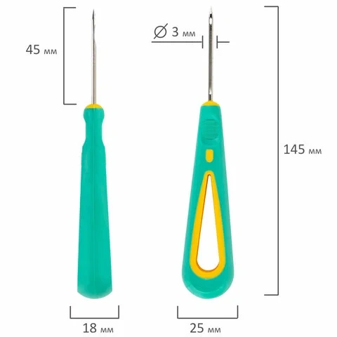 Игла с ушком диаметром 3 мм и длиной 4,5 см из стали с пластиковой цветной рукояткой. Шило обеспечивает прокалывание до 30 листов бумаги. Поставляется в блистере с подвесом.