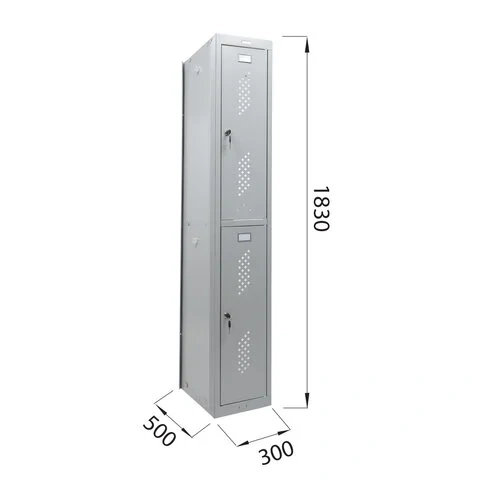 Шкаф имеет 2 раздельные секции и предназначен для 2 пользователей. На дверях установлены ключевые замки (2000 комбинаций). На каждую дверь в комплекте 2 ключа.