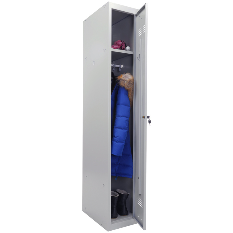 Шкаф для одежды, базовый модуль. Комплектуется дополнительным модулем для выстраивания ряда шкафов необходимой длины.Модульная система локеров (ML) предлагает новый технологический подход в улучшении качества и функциональности шкафов для раздевалок (локеров).Шкафы серии ML предназначены для хранения одежды в производственных, спортивных, офисных и других помещениях, а также хозяйственного инвентаря. Преимущества: - устойчивый и прочный корпус.В конструктивную суть модулей ML заложили прокатную сварную раму каркаса, что обеспечивает правильную геометрию и прочность корпуса. Совместно с другими конструкторскими решениями, обеспечивает отменную прочность и устойчивость шкафа, сравнимую со сварными конструкциями (замкнутый прямоугольный профиль задней части корпуса).Жесткий надежный корпус шкафа, улучшает эстетику внешнего вида (равномерные зазоры дверей), ровные ряды раздевалок или шкафов для хранения личных вещей.- сборка.Происходит вертикально, что облегчает работу в узких помещениях.- скорость сборки.Система фиксаторов «зацепов» облегчает подгонку и сборку деталей, увеличивает скорость сборки жесткость модуля шкафа.- модульная система. Система состоит из базового модуля и приставных дополнительных модулей.Специальные элементы боковых креплений на общей боковой стенке позволяют наращивать ряд модулей любой длины в зависимости от особенностей помещения.Шкафы оборудованы полками, перекладиной для плечиков, крючками для одежды.Дополнительно нижними полками. 2-мя типами перегородок для разделения чистой одежды и спецодежды.- улучшенная вентиляция.Дополнительные отверстия в задней стенке на 4 уровнях шкафа.- смена стороны открыванияУстановка дверей с левой и правой стороной открывания.