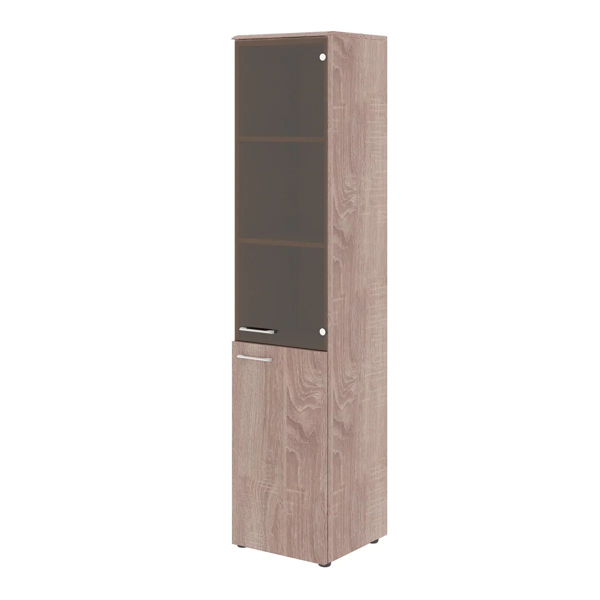 Универсальный шкаф комбинированный WAVE для офисного или домашнего использования. Размеры - 432х1949х432 мм, тип - правосторонний, цвет - Дуб Сонома. Шкаф имеет солидный топ из МДФ 19 мм. Оснащен 5 полками, две нижние полки закрыты дверцей из ЛДСП, три верхние - стекляной дверцей. На всех дверцах имеются долговечные и стильные металлические ручки. Конструкция шкафа оснащена прочными силовыми креплениями – эксцентриковыми стяжками. Регулируемые по высоте опоры обеспечат шкафу устойчивость на неровном полу.