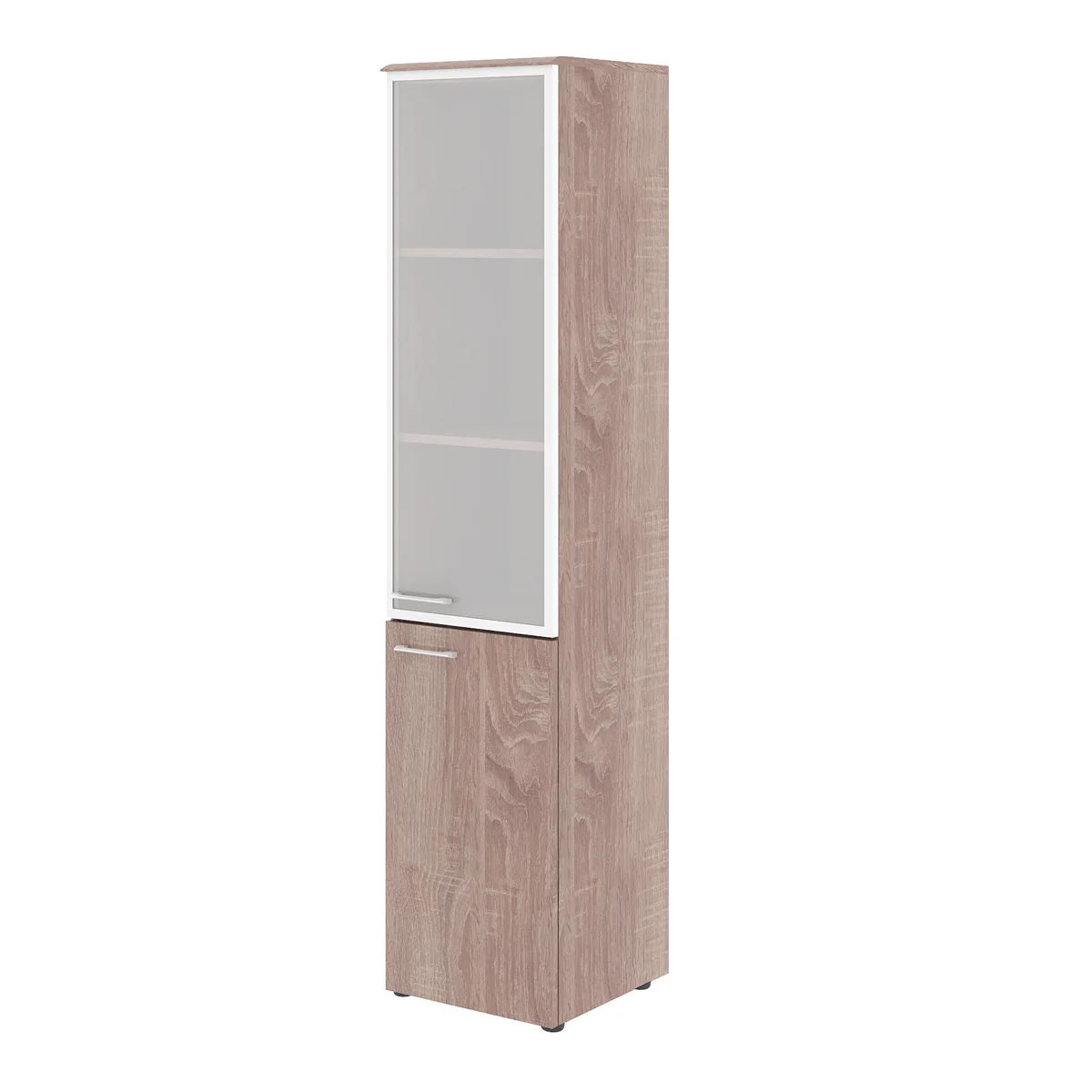 Универсальный шкаф комбинированный WAVE для офисного или домашнего использования. Размеры - 432х1949х432 мм, тип - правосторонний, цвет - Дуб Сонома. Шкаф имеет солидный топ из МДФ 19 мм. Оснащен 5 полками, две нижние полки закрыты дверцей из ЛДСП, три верхние - стекляной дверцей со стильной матовой тонировкой в металлической рамке. На всех дверцах имеются долговечные и стильные металлические ручки. Конструкция шкафа оснащена прочными силовыми креплениями – эксцентриковыми стяжками. Регулируемые по высоте опоры обеспечат шкафу устойчивость на неровном полу.