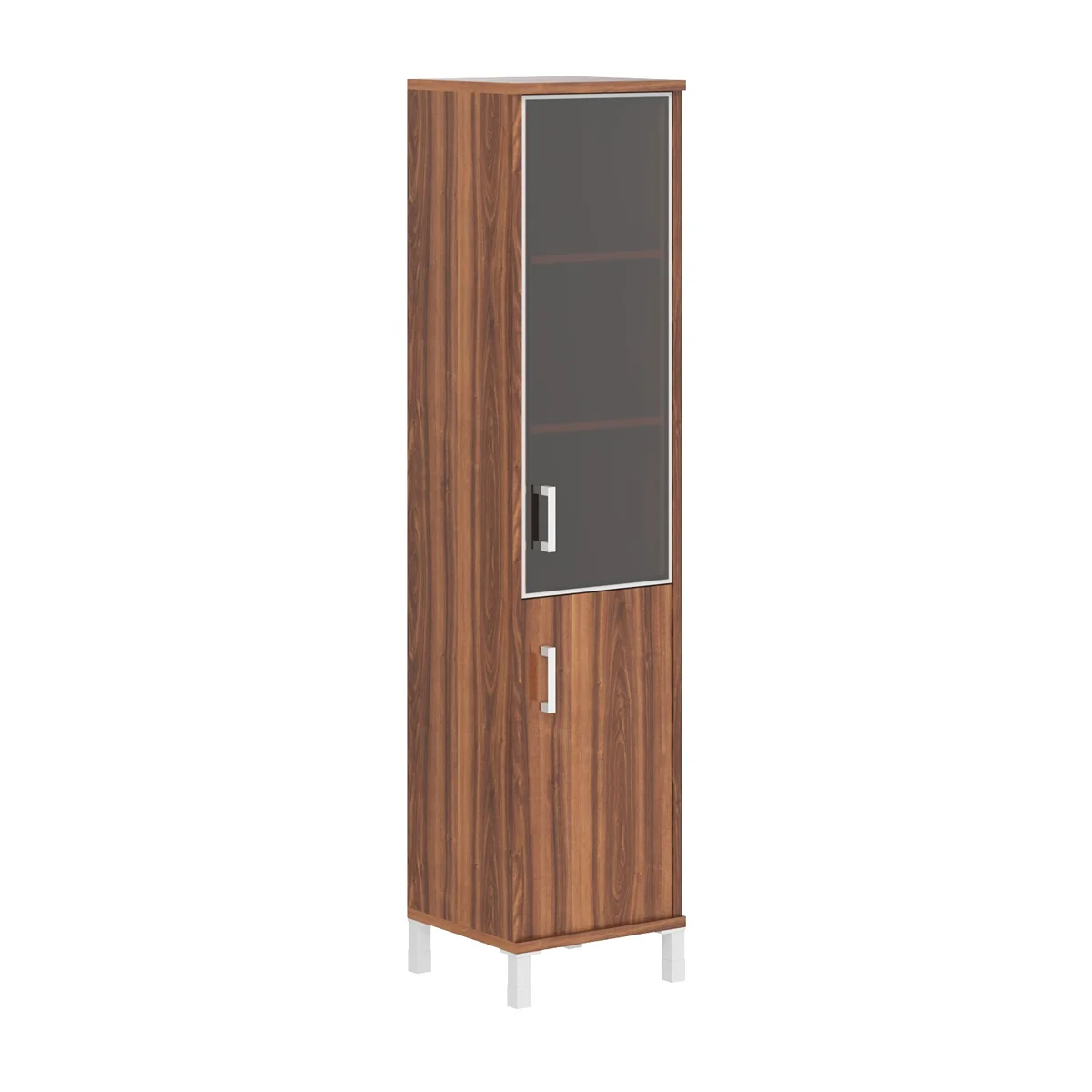 Универсальный комбинированный шкаф BORN для офисного или домашнего использования. Размеры - 475х2054х450 мм, тип – правосторонний, цвет – Орех Даллас. Шкаф имеет опоры увеличенной длины. Оснащен 5 полками, две нижние закрыты дверцей из ЛДСП под цвет конструкции, три верхние – стеклянной дверцей с металлической рамкой по краям. На дверцах установлены стильные металлические ручки. Конструкция шкафа оснащена прочными силовыми креплениями – эксцентриковыми стяжками. Все торцы основных элементов шкафа надежно защищены кромкой ПВХ – 2 мм. Регулируемые по высоте опоры обеспечат шкафу устойчивость на неровном полу.