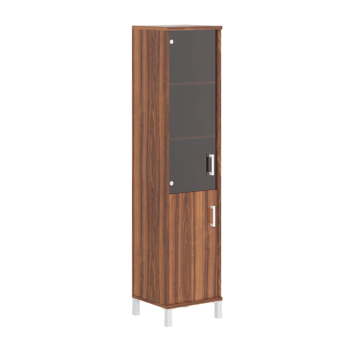 Универсальный комбинированный шкаф BORN для офисного или домашнего использования. Размеры - 475х2054х450 мм, тип – левосторонний, цвет – Орех Даллас. Шкаф имеет опоры увеличенной длины. Оснащен 5 полками, две нижние закрыты дверцей из ЛДСП под цвет конструкции, три верхние – стеклянной дверцей. На дверцах установлены стильные металлические ручки. Конструкция шкафа оснащена прочными силовыми креплениями – эксцентриковыми стяжками. Все торцы основных элементов шкафа надежно защищены кромкой ПВХ – 2 мм. Регулируемые по высоте опоры обеспечат шкафу устойчивость на неровном полу.
