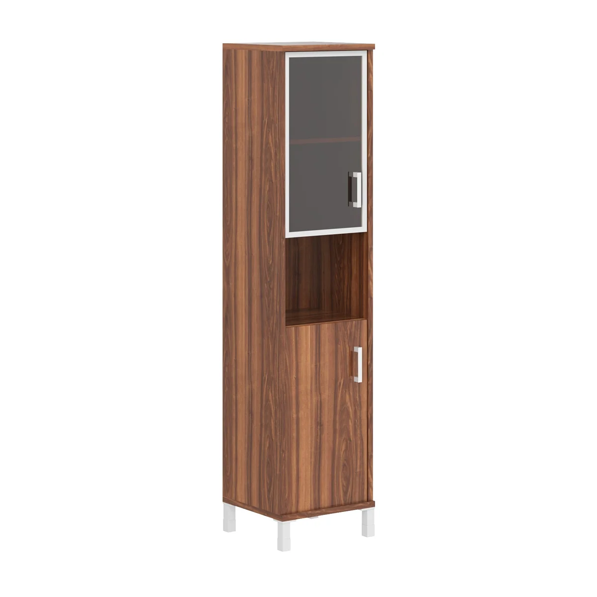 Компактный и высокий комбинированный шкаф BORN для офисного или домашнего использования. Размеры - 475х2054х450 мм, тип – левосторонний, цвет – Орех Даллас. Оснащен 5 просторными полочками, 2 нижние закрываются дверцей из ЛДСП, 2 верхние – стеклянной дверцей с металлической рамкой, а посередине одна открытая полочка. На дверцах установлены стильные металлические ручки. Шкаф имеет опоры увеличенной длины. Конструкция оснащена прочными силовыми креплениями – эксцентриковыми стяжками. Все торцы основных элементов шкафа надежно защищены кромкой ПВХ – 2 мм. Регулируемые по высоте опоры обеспечат шкафу устойчивость на неровном полу.
