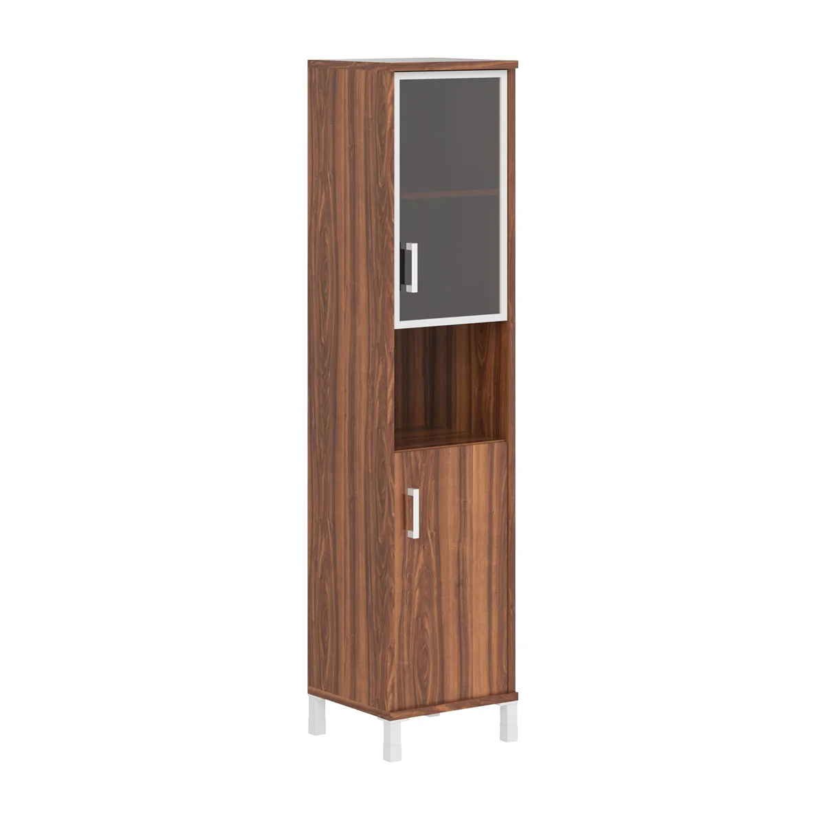 Компактный и высокий комбинированный шкаф BORN для офисного или домашнего использования. Размеры - 475х2054х450 мм, тип – правосторонний, цвет – Орех Даллас. Оснащен 5 просторными полочками, 2 нижние закрываются дверцей из ЛДСП, 2 верхние – стеклянной дверцей с металлической рамкой, а посередине одна открытая полочка. На дверцах установлены стильные металлические ручки. Шкаф имеет опоры увеличенной длины. Конструкция оснащена прочными силовыми креплениями – эксцентриковыми стяжками. Все торцы основных элементов шкафа надежно защищены кромкой ПВХ – 2 мм. Регулируемые по высоте опоры обеспечат шкафу устойчивость на неровном полу.