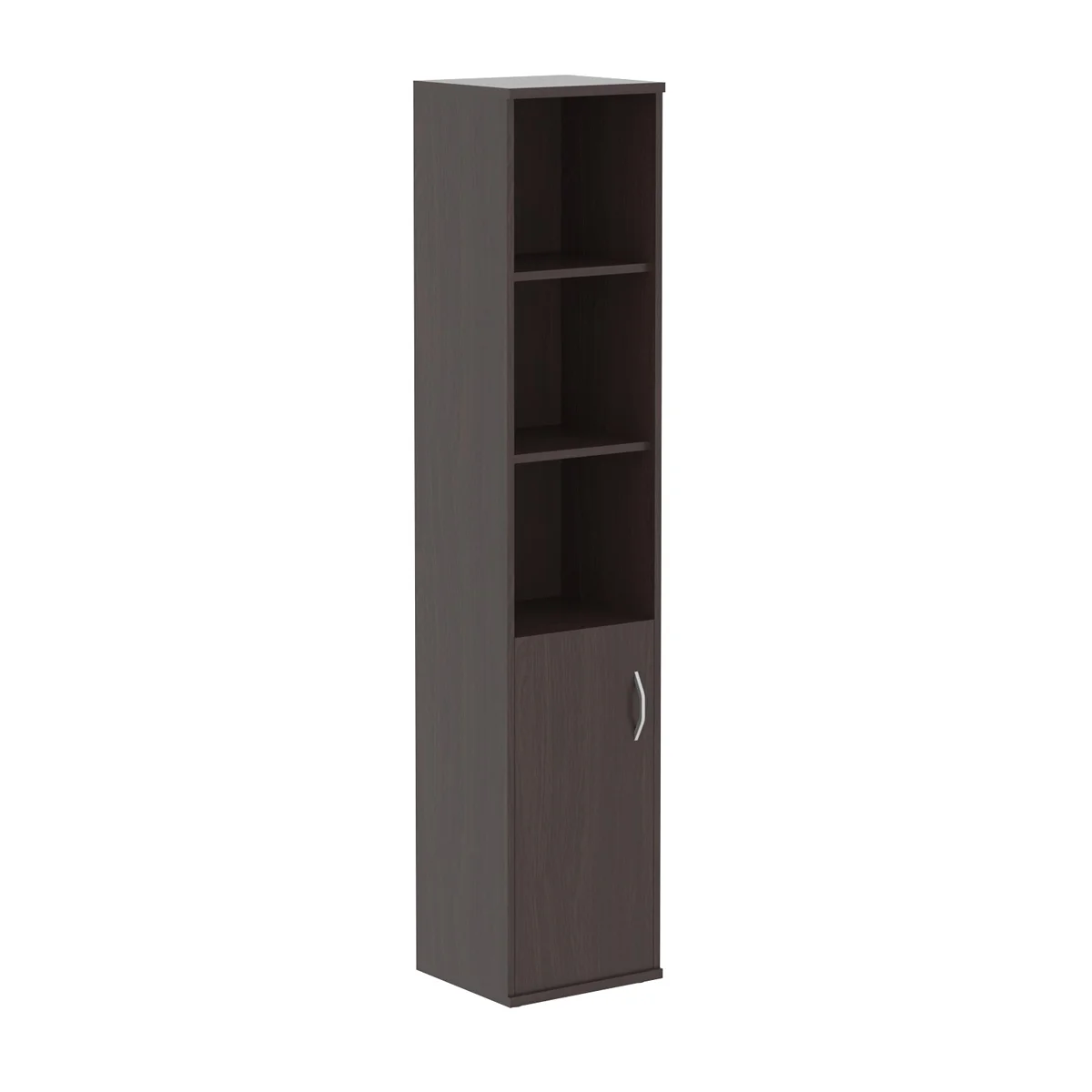 Компактный и высокий шкаф-стеллаж IMAGO для офисного или домашнего использования. Размеры -406х1975х365 мм, тип – левосторонний, цвет – Венге Магия. Оснащен 5 просторными полочками, 2 нижние закрываются дверцей из ЛДСП под цвет стеллажа, 3 верхние - открытые. На дверце установлена стильная металлическая ручка. Конструкция оснащена прочными силовыми креплениями – эксцентриковыми стяжками. Все торцы основных элементов стеллажа надежно защищены кромкой ПВХ – 2 мм. Регулируемые по высоте опоры обеспечат устойчивость на неровном полу.