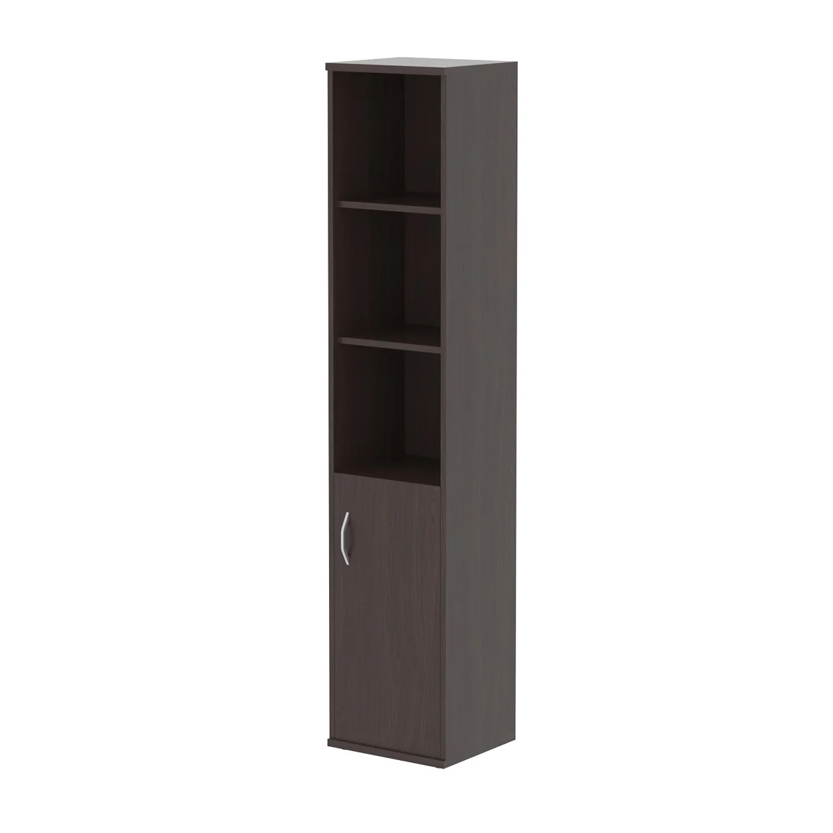 Компактный и высокий шкаф-стеллаж IMAGO для офисного или домашнего использования. Размеры -406х1975х365 мм, тип – правосторонний, цвет – Венге Магия. Оснащен 5 просторными полочками, 2 нижние закрываются дверцей из ЛДСП под цвет стеллажа, 3 верхние - открытые. На дверце установлена стильная металлическая ручка. Конструкция оснащена прочными силовыми креплениями – эксцентриковыми стяжками. Все торцы основных элементов стеллажа надежно защищены кромкой ПВХ – 2 мм. Регулируемые по высоте опоры обеспечат устойчивость на неровном полу.