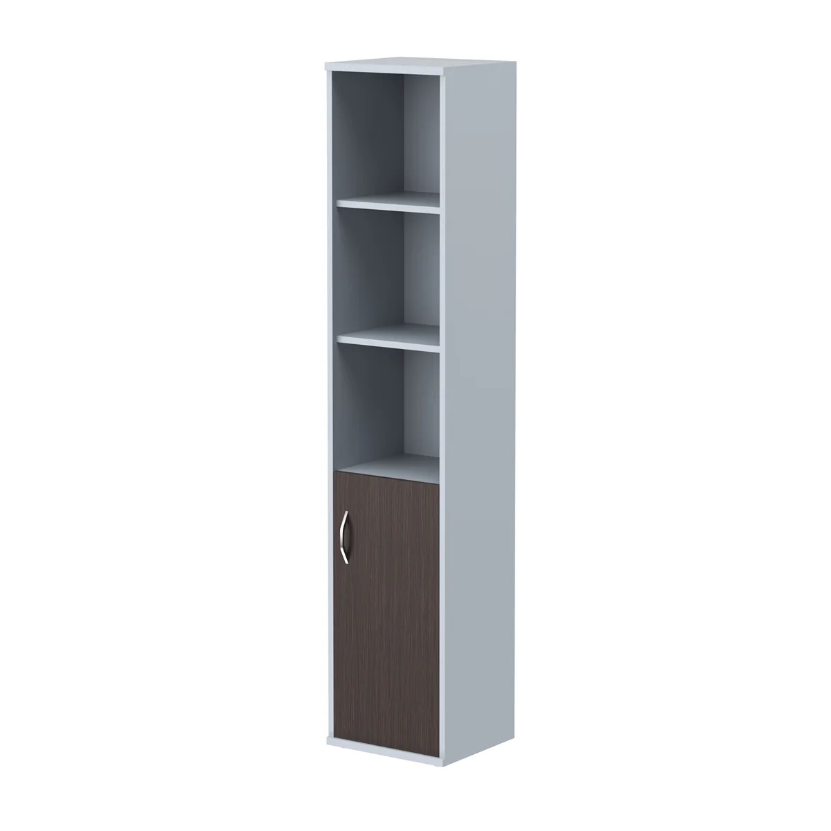 Шкаф-стеллаж правый IMAGO для офисного или домашнего использования. Размеры - 406х1975х365 мм, цвет - Венге Магия. Цвет каркаса - Металлик. Шкаф оснащен 5 полками, две нижние закрывает дверца из ЛДСП цвета Венге, три верхние - открытые. Шкаф оснащен регулируемыми опорами для компенсации неровностей пола.