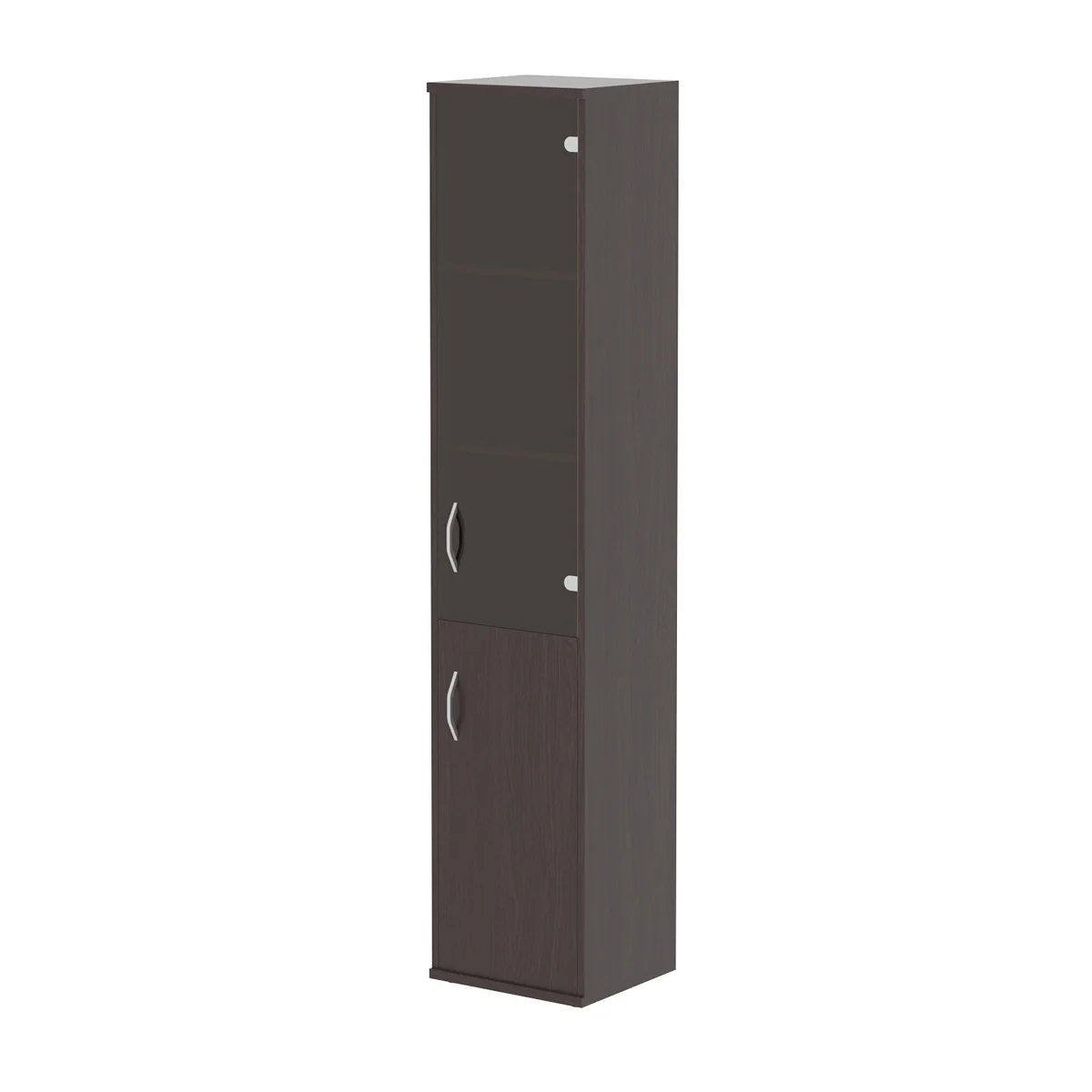 Компактный и высокий комбинированный шкаф IMAGO для офисного или домашнего использования. Размеры -406х1975х365 мм, тип – правосторонний, цвет – Венге Магия. Оснащен 5 просторными полочками, 2 нижние закрываются дверцей из ЛДСП под цвет шкафа, 3 верхние – стеклянной дверцей. На всех дверцах установлены стильные металлические ручки. Конструкция оснащена прочными силовыми креплениями – эксцентриковыми стяжками. Все торцы основных элементов шкафа надежно защищены кромкой ПВХ – 2 мм. Регулируемые по высоте опоры обеспечат устойчивость на неровном полу.