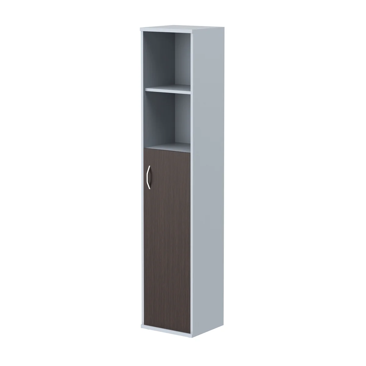 Компактный и высокий шкаф-стеллаж IMAGO для офисного или домашнего использования. Размеры - 406х1975х365 мм, тип – правосторонний, цвет – Венге Магия/Металлик. Оснащен 5 просторными полочками, 3 нижние закрываются контрастной дверцей из ЛДСП, 2 верхние - открытые. На дверце установлена стильная металлическая ручка. Конструкция оснащена прочными силовыми креплениями – эксцентриковыми стяжками. Все торцы основных элементов стеллажа надежно защищены кромкой ПВХ – 2 мм. Регулируемые по высоте опоры обеспечат устойчивость на неровном полу.