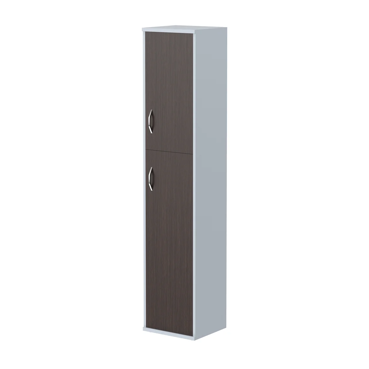 Компактный и высокий шкаф IMAGO для офисного или домашнего использования. Размеры - 406х1975х365 мм, тип – правосторонний, цвет – Венге Магия/Металлик. Оснащен 5 просторными полочками, 3 нижние и 2 верхние отдельно закрываются контрастными дверцами из ЛДСП. На дверцах установлены стильные металлические ручки. Конструкция оснащена прочными силовыми креплениями – эксцентриковыми стяжками. Все торцы основных элементов шкафа надежно защищены кромкой ПВХ – 2 мм. Регулируемые по высоте опоры обеспечат устойчивость на неровном полу.