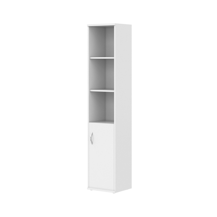 Универсальный шкаф-стеллаж правый IMAGO для офисного или домашнего использования. Размеры - 406х1975х365 мм, цвет - Белый. Оснащен 5 полками, две нижние закрывает дверца из ЛДСП, три верхние - открытые. Шкаф оснащен регулируемыми опорами для компенсации неровностей пола.