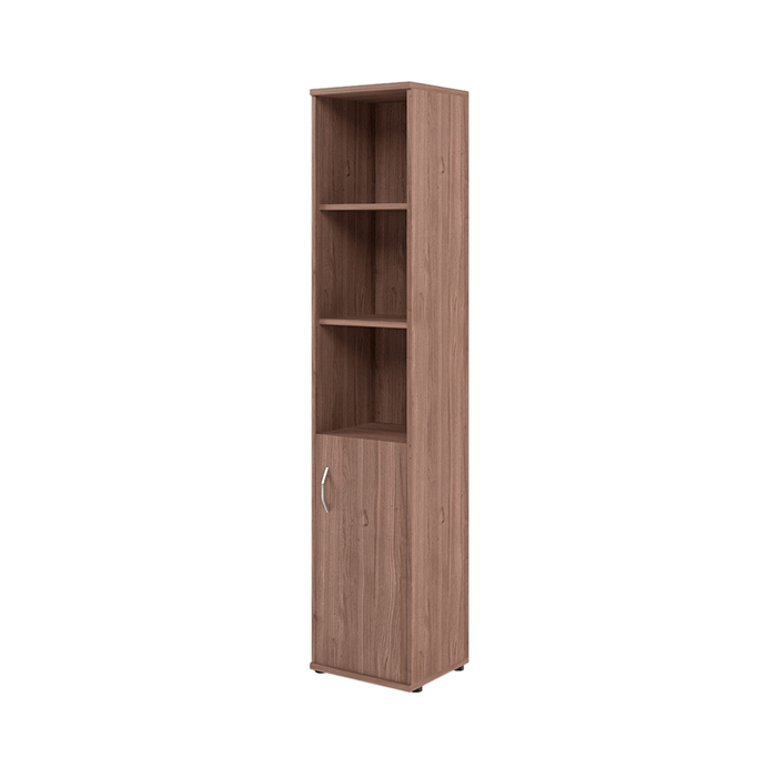 Универсальный шкаф-стеллаж левый IMAGO для офисного или домашнего использования. Размеры - 406х1975х365 мм, цвет - Ясень шимо. Оснащен 5 полками, две нижние закрывает дверца из ЛДСП, три верхние - открытые. Шкаф оснащен регулируемыми опорами для компенсации неровностей пола.