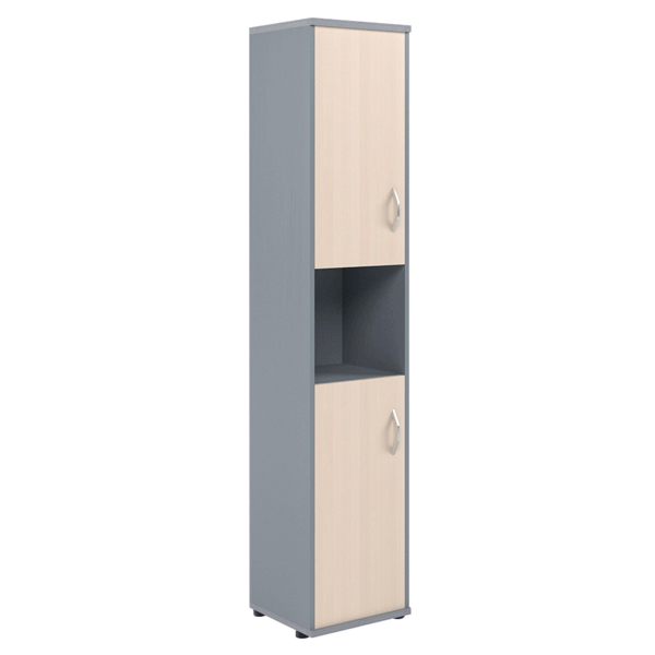 Компактный и высокий шкаф IMAGO для офисного или домашнего использования. Размеры - 406х1975х365 мм, цвет – Клен/Металлик. Оснащен 5 просторными полочками, 2 нижние и 2 верхние отдельно закрываются дверцами из ЛДСП другого цвета, а посередине одна открытая ниша. На всех дверцах установлены стильные металлические ручки. Конструкция оснащена прочными силовыми креплениями – эксцентриковыми стяжками. Все торцы основных элементов шкафа надежно защищены кромкой ПВХ – 2 мм. Регулируемые по высоте опоры обеспечат устойчивость на неровном полу.