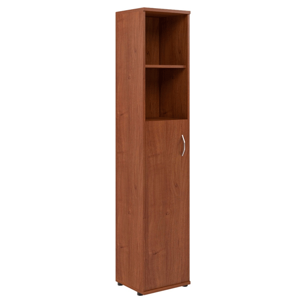 Компактный и высокий шкаф-стеллаж IMAGO для офисного или домашнего использования. Размеры - 406х1975х365 мм, тип – левосторонний, цвет – Орех Французский. Оснащен 5 просторными полочками, 3 нижние закрываются дверцей из ЛДСП под цвет стеллажа, 2 верхние - открытые. На дверце установлена стильная металлическая ручка. Конструкция оснащена прочными силовыми креплениями – эксцентриковыми стяжками. Все торцы основных элементов стеллажа надежно защищены кромкой ПВХ – 2 мм. Регулируемые по высоте опоры обеспечат устойчивость на неровном полу.