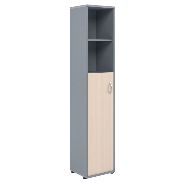 Компактный и высокий шкаф-стеллаж IMAGO для офисного или домашнего использования. Размеры - 406х1975х365 мм, тип – левосторонний, цвет – Клен/Металлик. Оснащен 5 просторными полочками, 3 нижние закрываются дверцей из ЛДСП другого цвета, 2 верхние - открытые. На дверце установлена стильная металлическая ручка. Конструкция оснащена прочными силовыми креплениями – эксцентриковыми стяжками. Все торцы основных элементов стеллажа надежно защищены кромкой ПВХ – 2 мм. Регулируемые по высоте опоры обеспечат устойчивость на неровном полу.